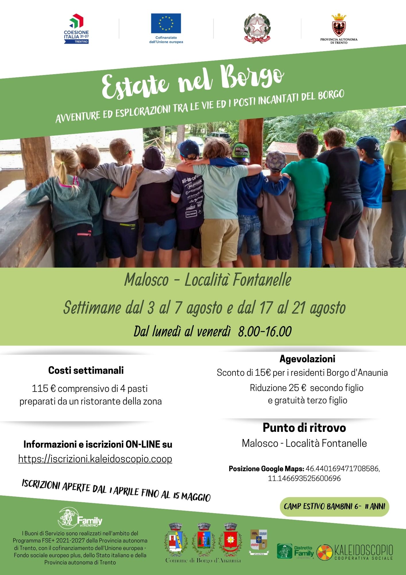 Le attività sono rivolte a bambini dai 6 agli 11 anni (scuola primaria) e sono strutturate in pacchetti settimanali, dal lunedì al venerdì con orario 8.00-16.00. Una giornata eccezionale attende i nostri giovani esploratori, con un pranzo al sacco curato con affetto dalla famiglia, seguito da un'indimenticabile avventura nella pittoresca frazione di Malosco. Mentre per le restanti quattro giornate della settimana, il bosco si trasformerà in una vasta sala giochi, la pineta diventerà un laboratorio di scoperte, la piazza un palcoscenico per avventure straordinarie e il campo da gioco un'arena di svago senza fine! Durante queste giornate, potremo anche deliziare il palato con squisiti pasti presso i ristoranti locali, pronti a ricaricarci per le prossime emozionanti avventure!